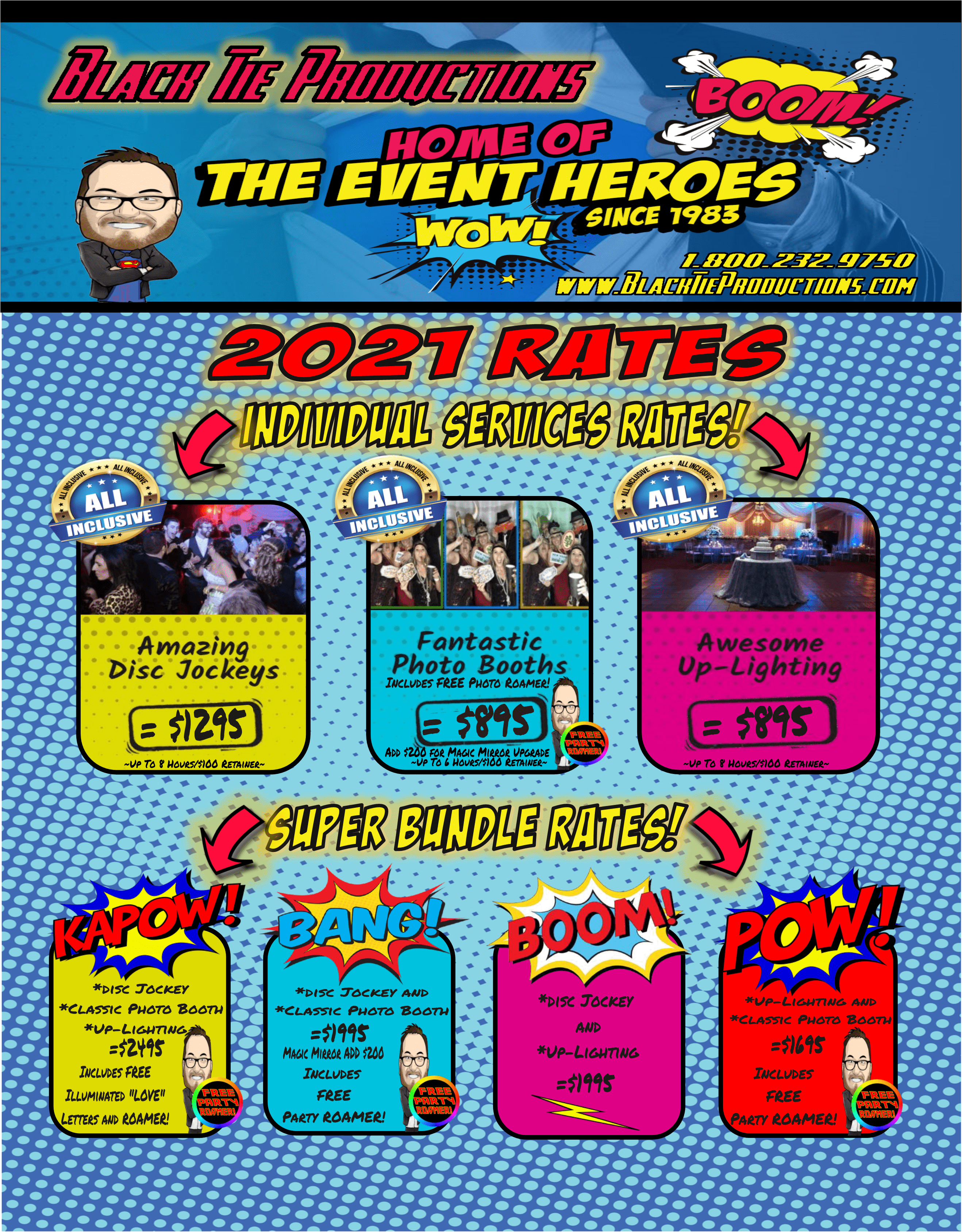 ![๐ Unleash the Power of Celebration! ๐ Calling all future heroes of love and laughter! ๐ Transform your wedding into an epic event with our superhero-inspired lineup of services. Weve got the ultimate team-up to ensure your special day is nothing short of legendary! ๐ง DJ Dynamix: Our master of beats will keep your dance floor electrified all night long! ๐ธ Photo Booth Flash: Strike a pose and capture those unforgettable moments with a burst of comic-style flair! ๐ก Lighting Luminary: Illuminate your celebration with event lighting that creates a supercharged atmosphere fit for legends! Choose Your Adventure: ๐ฆธโโ๏ธ *Individual Services* - Customize your experience, picking exactly what you need to save the day. ๐ช *Epic Bundle Deals* - Combine forces for ultimate savings and watch as each element enhances the other in perfect harmony! Suit up in style and prepare for an adventure that will echo through the ages. Book today, because when it comes to weddings...heroes always rise to shine! ๐ โจ [Contact Us Now] โจ. :The Event Heroes at Black Tie Productions](https://blacktieproductions.com/wp-content/uploads/2020/02/2021-Rates-234x300.png)