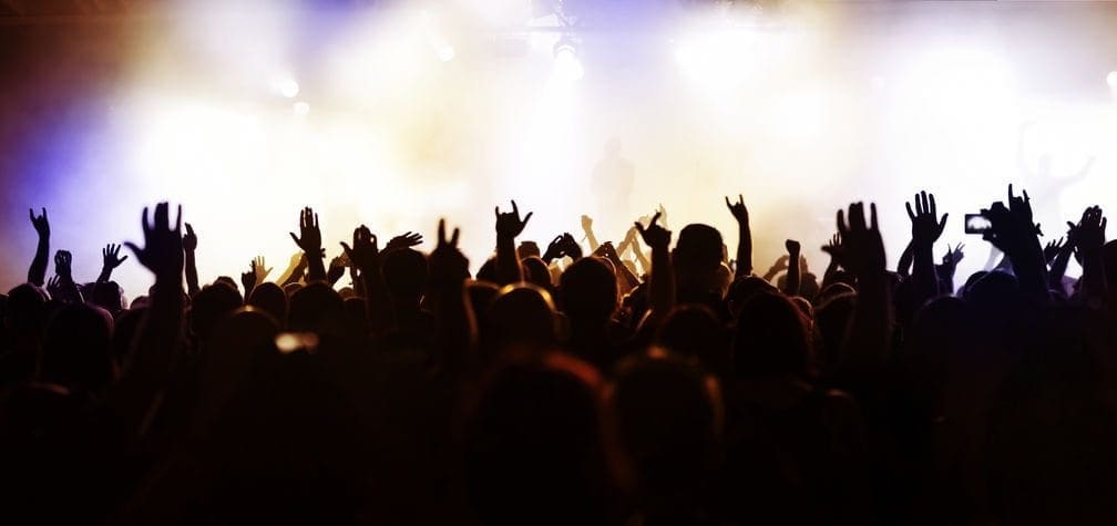 Black Tie Productions: A large crowd at a concert with silhouettes of raised hands and cheering fans enjoys top-tier party entertainment. Bright stage lights illuminate the scene, creating a dramatic atmosphere. The smoky background highlights the energetic and lively environment, reminiscent of an electrifying wedding reception DJ performance. :Your Event Heroes