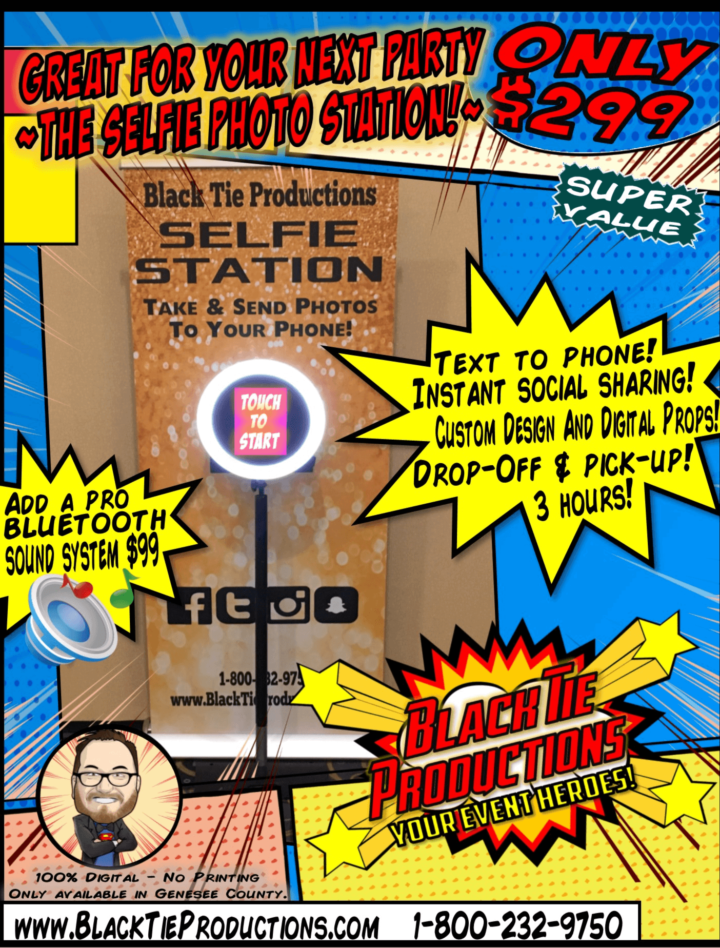Unleash the power of Black Tie Productions exclusive Selfie Station, now just $299! Elevate any event to superhero status with this state-of-the-art marvel. Crafted for champions, it comes equipped with custom design mastery, digital prop wizardry, a Bluetooth sound system to resonate through universes, and effortless photo-sharing capabilities. Whether you’re teaming up with the Event Heroes or adding dynamic flair to your Michigan wedding adventure, let vibrant colors and bold text light up your epic celebration!. :The Event Heroes at Black Tie Productions