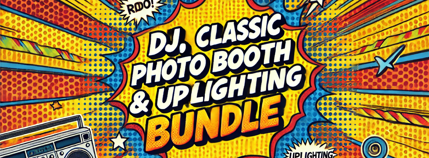 In a world where weddings need a heroic touch, behold the electrifying comic-style graphic that bursts onto the scene: Introducing the ultimate DJ, Classic Photo Booth & Up Lighting Bundle! With dazzling illustrations of a boombox and microphone, this powerhouse package is ready to save your Michigan wedding. Brought to you by the legendary Black Tie Productions, your day will be one for the history books!. :The Event Heroes at Black Tie Productions