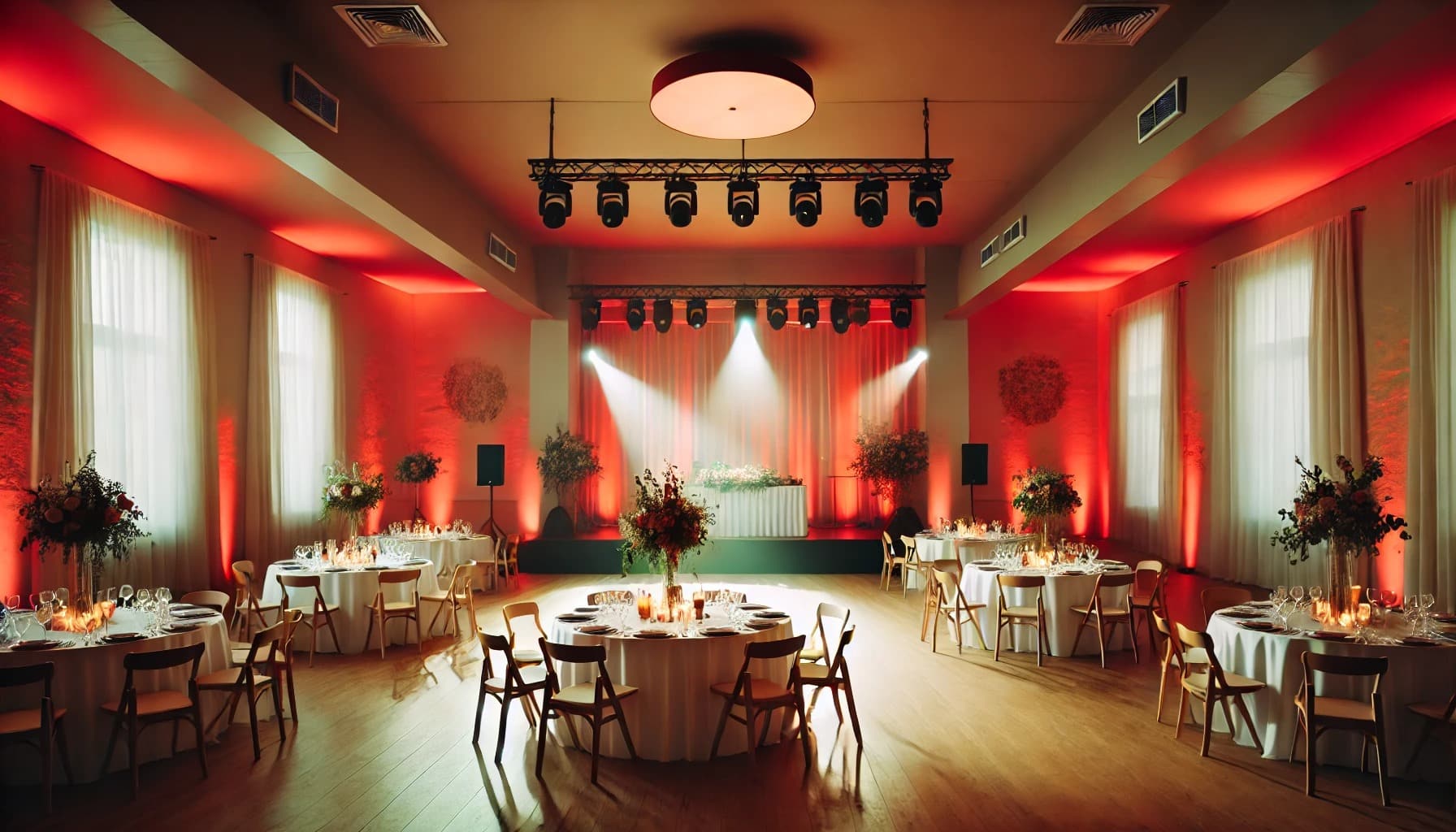 Black Tie Productions: The dimly lit banquet hall features round tables with white tablecloths and elegant floral centerpieces, enhanced by wedding uplighting that casts a warm red glow for a cozy ambiance. A stage with a curtain and spotlights awaits the fun wedding DJ, while large windows with sheer curtains line the side walls. :Your Event Heroes