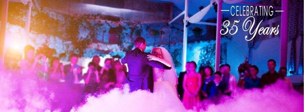 Amidst a swirling haze of mystical smoke, a dynamic duo glides across the dance floor with the grace of legendary heroes. Behind them, a bold emblem declares Celebrating 35 Years, marking an era of timeless tales and epic achievements. The air is electrified by the powerful rhythms of Michigans finest sound sorcerer—the Wedding DJ—whose tunes are flawlessly orchestrated by none other than Event Heroes, masters in crafting unforgettable moments. :The Event Heroes at Black Tie Productions