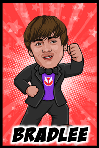 Dynamic cartoon of a suited boy hero flexing his arm, framed by a bold red starburst, with the heroic name BRADLEE below. :The Event Heroes at Black Tie Productions