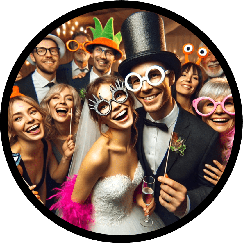 In the vibrant realm of celebration, the heroic bride and groom don their whimsical eyewear, standing valiantly with beaming compatriots at the grand wedding fête. Around them swirls an electrifying aura of joy as revelers cloak themselves in novelty glasses and hats, transforming the gathering into a jubilant league of merriment defenders. Together, they forge an unbreakable alliance of festivity!. :The Event Heroes at Black Tie Productions
