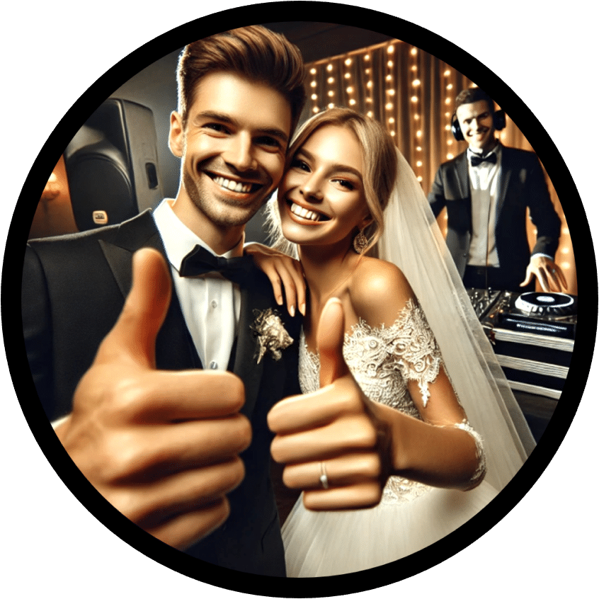 In a world of swirling romance and electrifying beats, the dynamic duo of love—Bride and Groom—radiate joy in their resplendent formal armor, each giving a powerful thumbs up that signals triumph over all odds. Behind them, master of rhythms DJ Sonic stands ready at his command console, where turntables hum with anticipation. Their epic celebration unfolds beneath an enchanting canopy of twinkling star-like string lights, illuminating the night as their league of guests rejoices in this legendary union. :The Event Heroes at Black Tie Productions