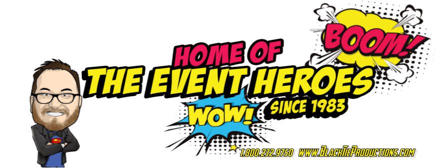 Black Tie Productions: Cartoon graphic with text: Home of the Event Heroes in bold yellow and black. Colorful bursts shout Wow! and comic-style Boom!. Features a cartoon man with glasses and beard. Ideal for Michigan wedding entertainment, contact 1800.232.2950 or visit www.BlockHireProductions.com. :Your Event Heroes