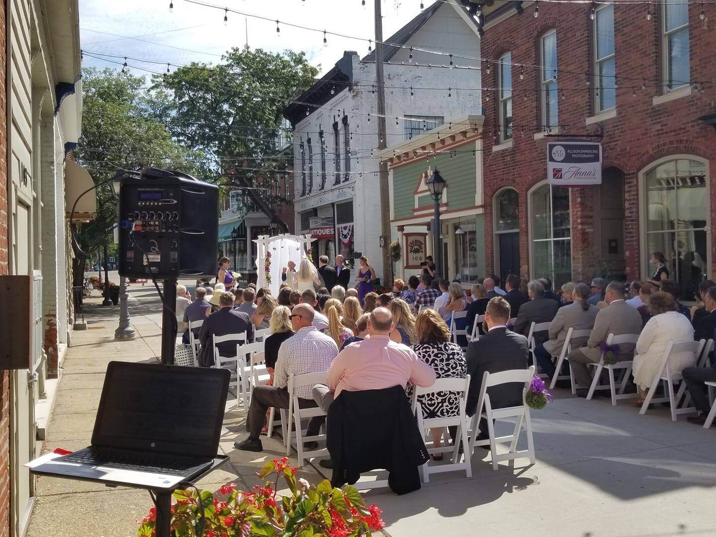 In the heart of the city, where charming brick buildings rise like steadfast guardians, an elegant outdoor street wedding ceremony unfolds. Guests, akin to noble allies, sit poised on white chairs under a canopy of twinkling string lights that dance in alliance with professional event illuminations. Justice and sophistication are served by a powerful duo—a speaker and a laptop from Black Tie Productions—standing vigilant on the left, orchestrating an aura of grace and grandeur as loves mission commences beneath this starry canopy. :The Event Heroes at Black Tie Productions