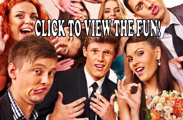 Black Tie Productions: A group of people making funny expressions and gestures while dressed formally. They are close together, smiling, and interacting playfully under vibrant wedding uplighting. The text CLICK TO VIEW THE FUN! is prominently displayed at the top of the image. The atmosphere is lively and humorous. :Your Event Heroes