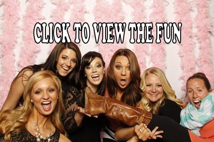Black Tie Productions: Six women pose playfully in front of a pink feather backdrop, embodying the essence of fun wedding DJ vibes. One woman holds a boot toward the camera as they all smile widely. Large text above reads, CLICK TO VIEW THE FUN! A perfect snapshot of unforgettable party entertainment. :Your Event Heroes