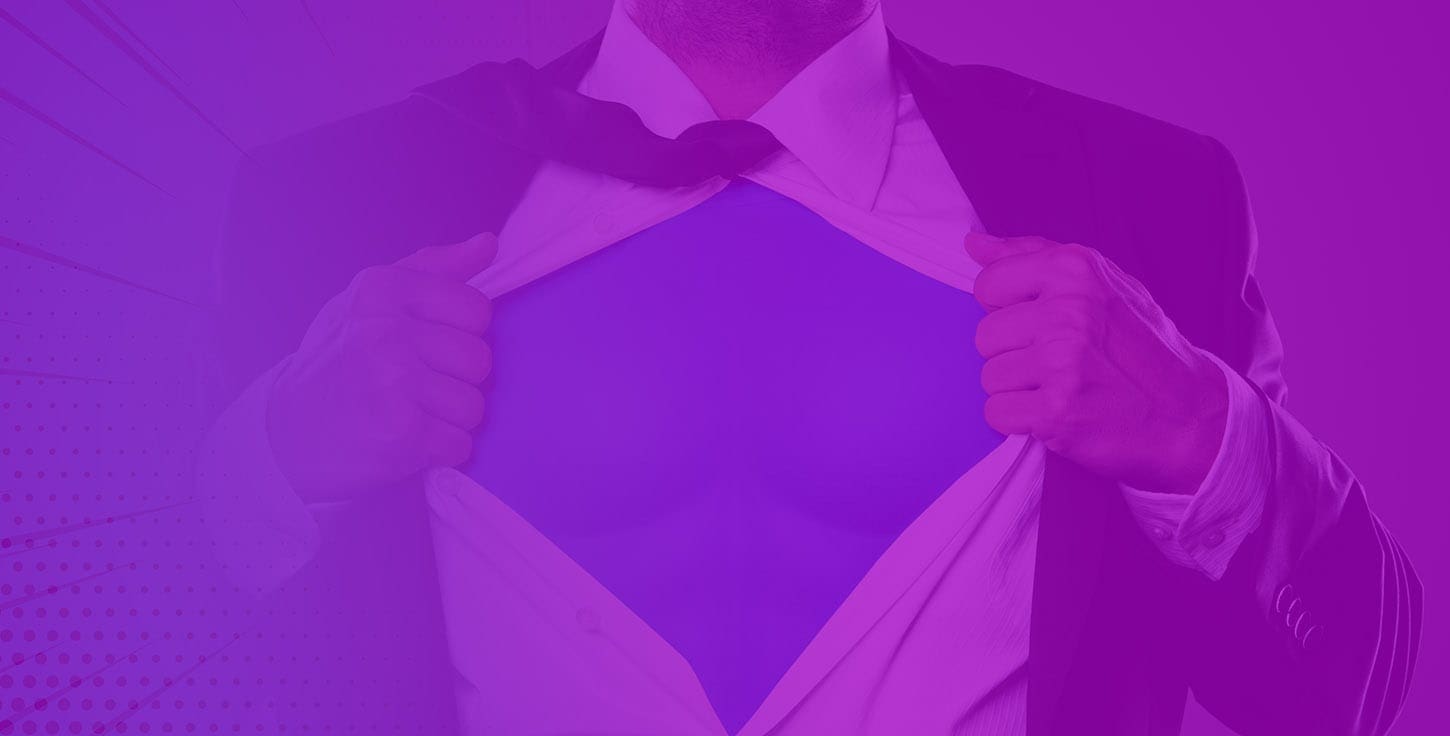 Black Tie Productions: A man in a suit pulls open his shirt to reveal a blue chest underneath, reminiscent of a superhero pose. The image has a pink and purple overlay, adding dramatic flair. Perfect for party entertainment or capturing memorable moments with a wedding photo booth at your event!. :Your Event Heroes