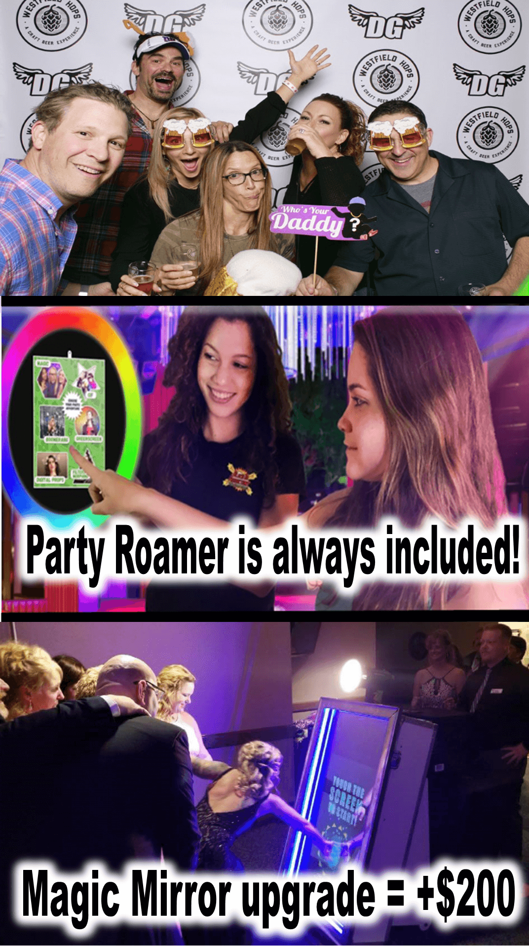 Black Tie Productions: A group of people pose with props in a photo booth at a Michigan wedding. Below, two women use a touchscreen with photo options while guests enjoy the fun wedding DJ and interact with a large, lit-up mirror. Text reads: Party Roamer is always included! and Magic Mirror upgrade = +$200. :Your Event Heroes
