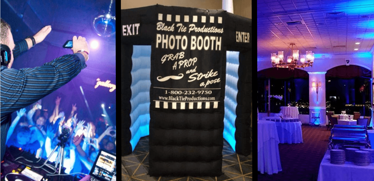 Behold the scene of epic celebration: a mighty Michigan DJ, the Maestro of Beats, ignites a supercharged crowd with electrifying tunes, transforming mere partygoers into dancing heroes. Nearby stands the legendary portal of memories—a photo booth emblazoned with Black Tie Productions, capturing timeless moments for those who dare to enter. And towering above it all, an exquisitely adorned event room glows in blue luminescence, its tables elegantly poised like sentinels of sophistication. :The Event Heroes at Black Tie Productions