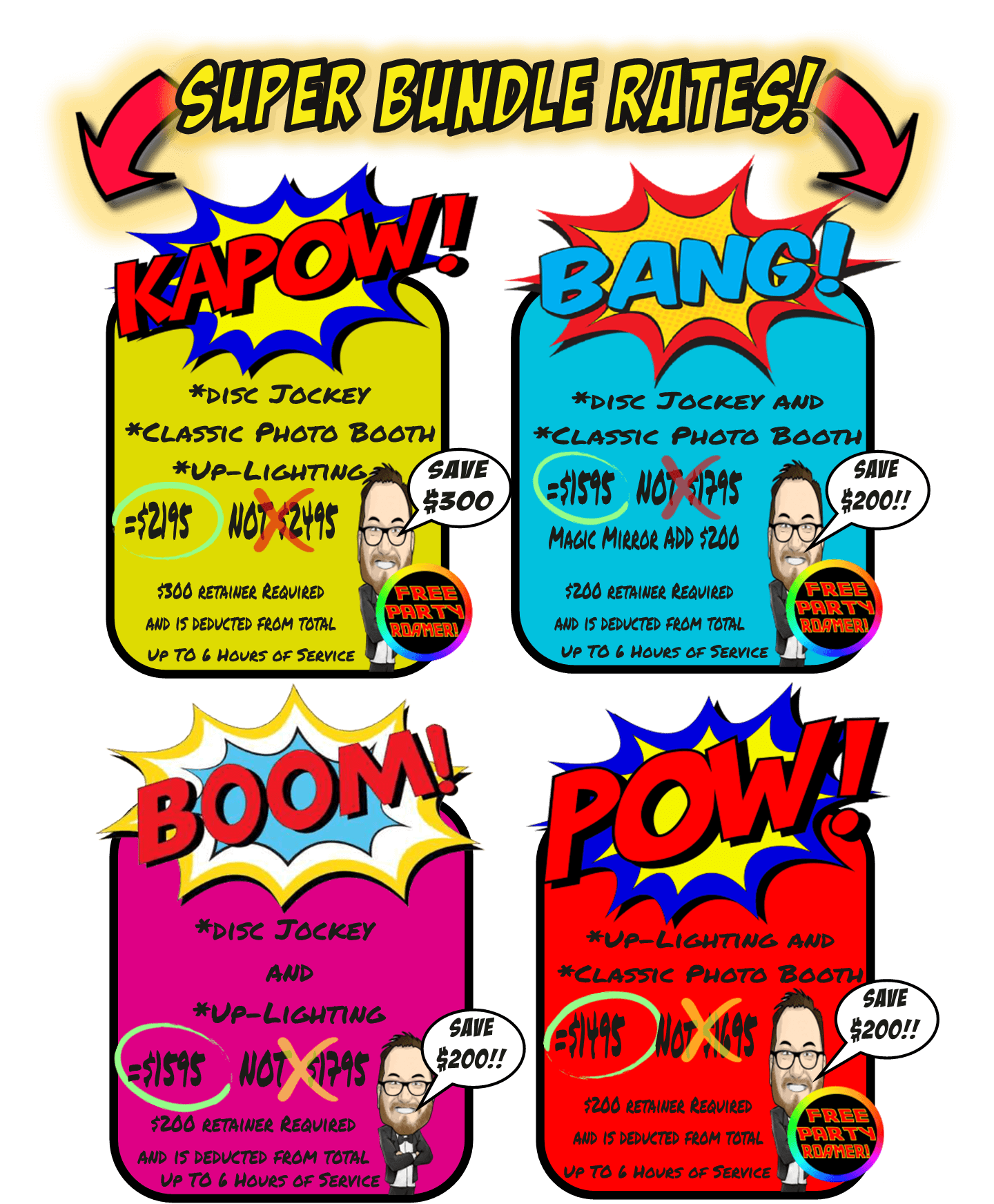 Behold the dazzling flyer, bursting with superhero flair, crafted by the mighty Event Heroes and the legendary Black Tie Productions! Unleash your inner superhero with our DJ and photo booth packages: KAPOW, BANG, BOOM, and POW. Explore a universe of prices and heroic savings or receive an instant price quote tailored to your extraordinary event. Assemble now for an unforgettable experience!. :The Event Heroes at Black Tie Productions