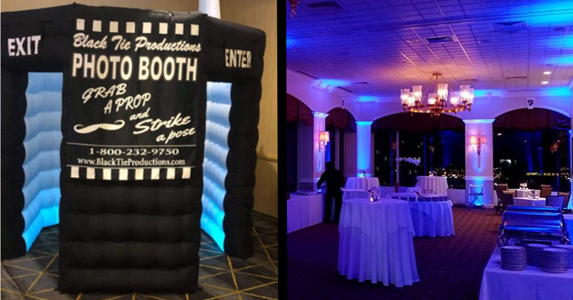 In the arena of celebration, an incredible black inflatable photo booth stands ready on the left like a fortress of nostalgia, guarding memories yet to be made. To the right, the event room unveils its magnificent domain: bathed in radiant blue light and adorned with round tables dressed in pristine white tablecloths. Above these gleams a legion of elegant chandeliers casting their shimmering glow. Here in this enchanting haven, moments are captured effortlessly with the help of a Michigan wedding DJ—a maestro offering instant quotes tailored to your unique desires—ensuring your epic event is nothing short of legendary!. :The Event Heroes at Black Tie Productions