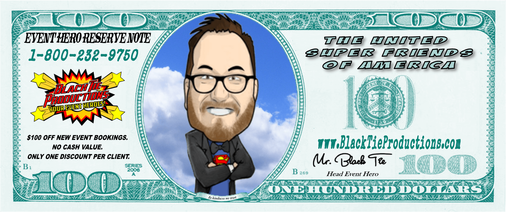 Amidst a whirlwind of color and action, the heroic Dollar Bill springs to life, emblazoned with the striking likeness of a bespectacled champion of festivities. This valiant currency brandishes bold proclamations as it heralds the legendary services of Black Tie Productions and the esteemed Event Hero Reserve Note. Whether youre planning your epic Michigan wedding or seeking justice in the form of unforgettable photo booth memories, this mighty note offers instantaneous price revelations to save your day with style and flair!. :The Event Heroes at Black Tie Productions