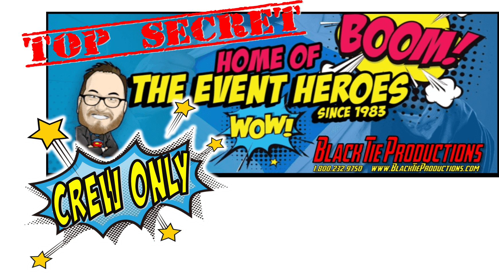 In the vibrant realm of enchantment, a dazzling banner emerges—a masterpiece of comic-style brilliance! Behold as Top Secret, Crew Only, and Home of the Event Heroes are emblazoned by none other than Black Tie Productions. With an illustrated heroic visage and retro comic flair, it stands ready to elevate your Michigan wedding festivities to legendary heights. Summon forth your inquiry now for an instant price quote—unleash the power of epic celebration!. :The Event Heroes at Black Tie Productions