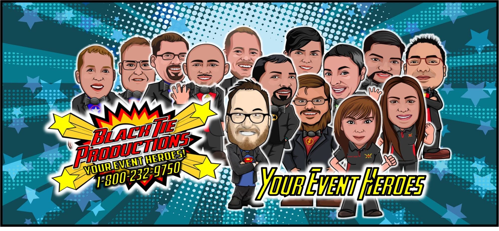 Introducing a vibrant cartoon illustration showcasing a dynamic lineup of superheroes, donned in eye-catching costumes, ready to save the day! Accompanying this thrilling image is the bold declaration: Black Tie Productions: Your Event Heroes! Need an instant price quote? Dont hesitate—reach out to our hero hotline today at the number provided!. :The Event Heroes at Black Tie Productions