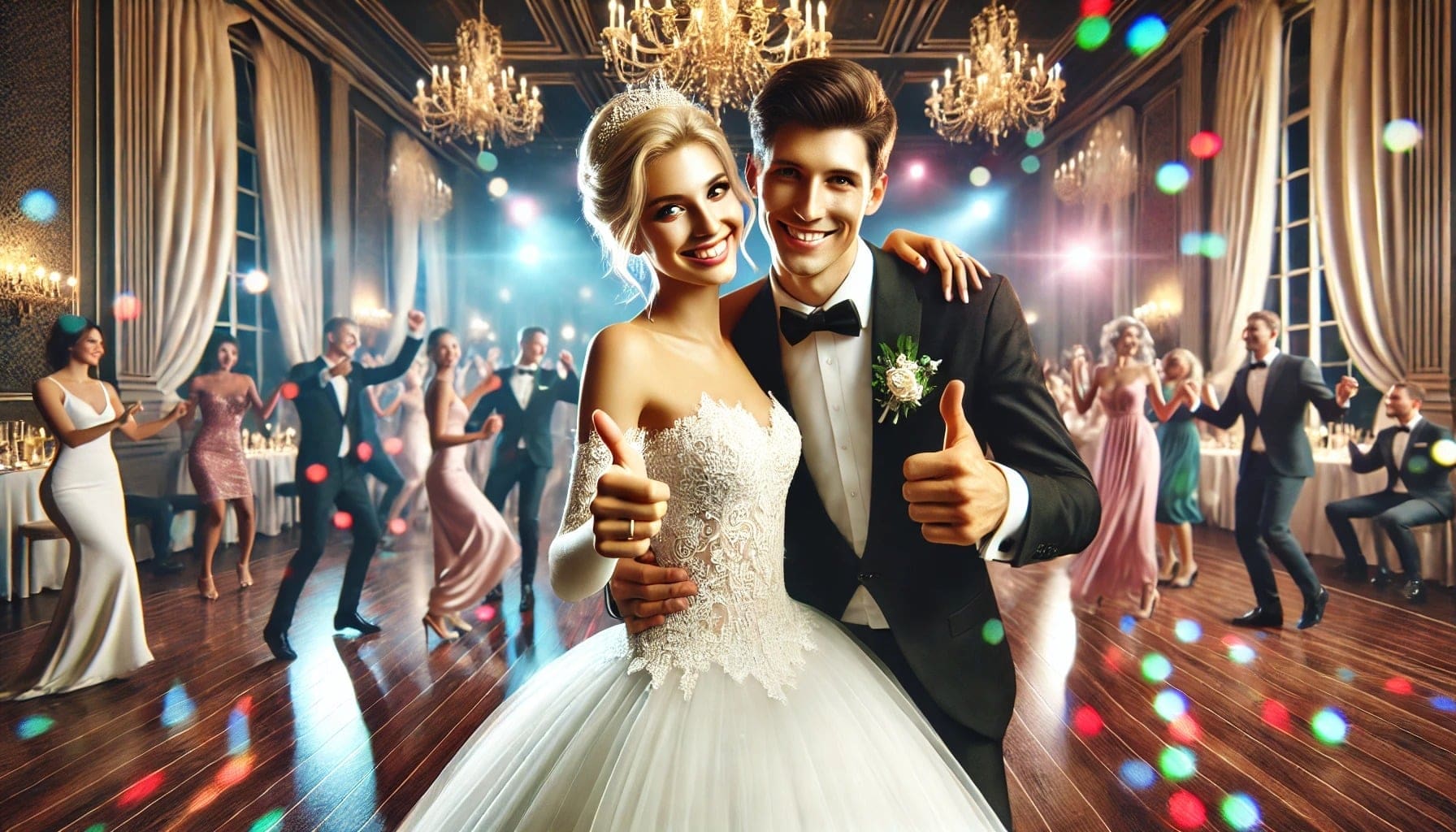 As the radiant Bride and the dashing Groom strike a heroic pose with thumbs raised high on the vibrant dance floor, they are encircled by a league of elegantly attired guests. Majestic chandeliers overhead unleash beams of colorful brilliance, crafting an aura of celebration and splendor. Preserve this epic moment for eternity with Event Heroes legendary photo booth rental—because superheroes deserve memories that last forever!. :The Event Heroes at Black Tie Productions
