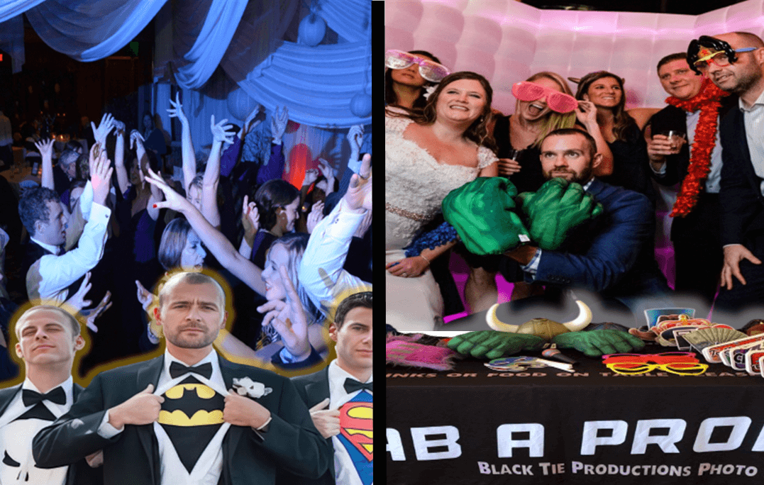 On the left, beneath a dazzling canopy of vibrant event lighting, partygoers transform the scene into a kaleidoscope of energy and movement, every dance step as powerful as a superheros leap. On the right, a dynamic team strikes heroic poses for an epic portrait adventure. Armed with whimsical props like gravity-defying hats and colossal glasses, they conquer moments of joy at a wedding venue turned fortress of fun—all thanks to Black Tie Productions’ legendary photo booth rental. :The Event Heroes at Black Tie Productions