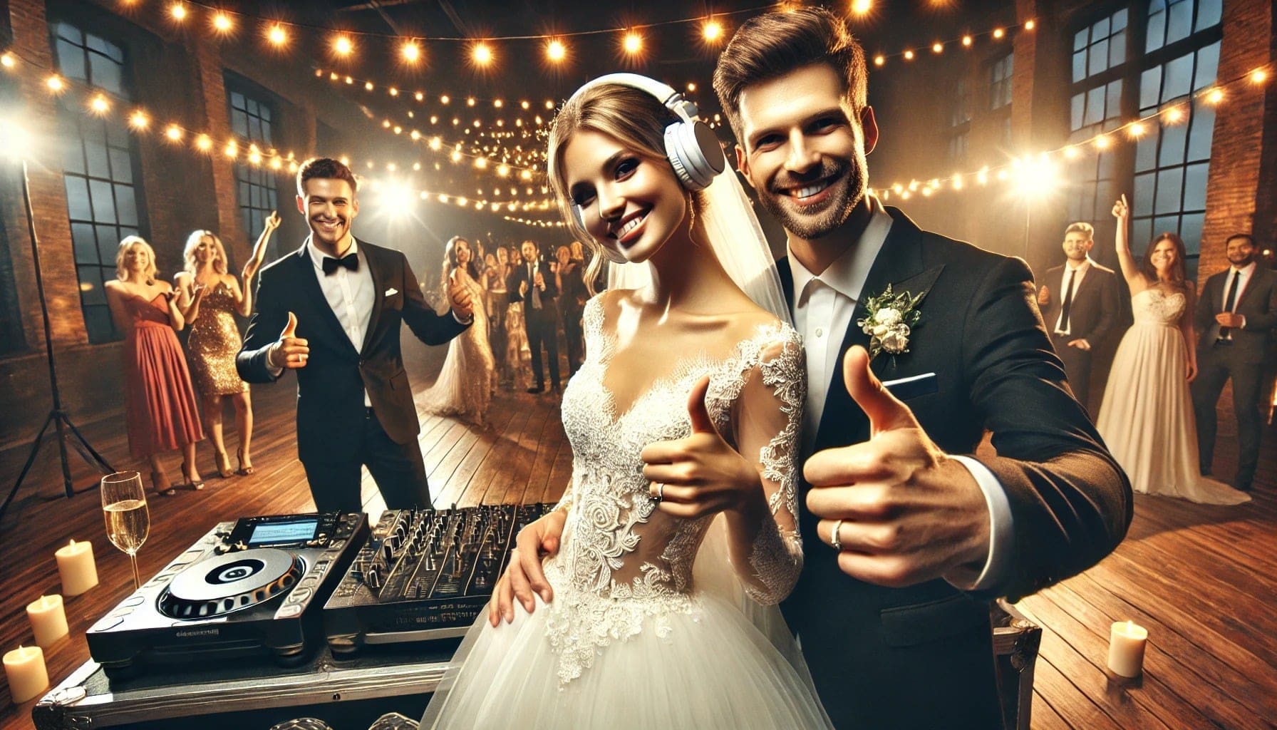 Amidst a sea of joyful onlookers at a stunning wedding venue, our dynamic duo—the bride and groom—strike an epic pose next to their DJ console. The bride, sporting superhero-like headphones that channel the tunes of celebration, joins her partner as they flash thumbs up to the crowd. Above them, strings of shimmering lights create a celestial canopy, enhancing this momentous occasion orchestrated by none other than Event Heroes, the ultimate masters of memorable moments. :The Event Heroes at Black Tie Productions
