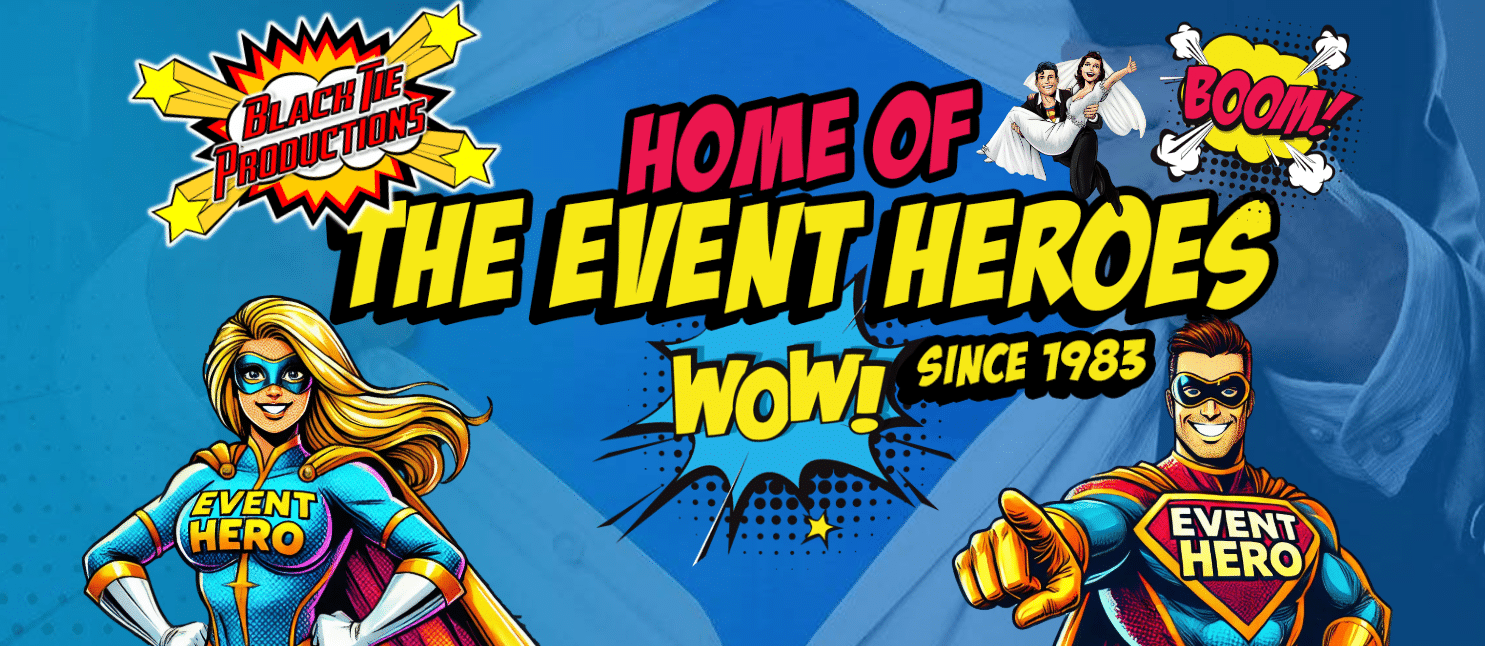 Dynamic comic graphic for Black Tie Productions! Event Hero superstars strike bold—Home of The Event Heroes! Wow! Since 1983. :The Event Heroes at Black Tie Productions