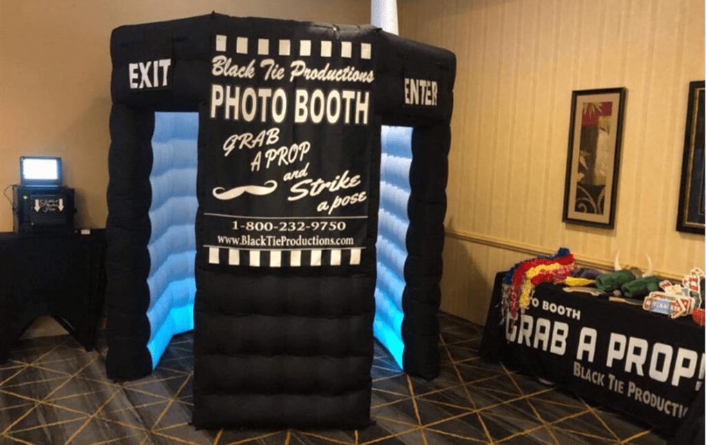 In the grand hall of celebration, where memories await their immortalization, stands a colossus of captured magic—the Inflatable Photo Booth! Adorned with the emblem of Black Tie Productions, this mighty structure graces the room with its presence. Beside it lies a trove of delightful props, ready to assist in crafting legendary moments. Perfect for any Michigan wedding or event, this heroic setup ensures that every memory is preserved in glorious fashion!. :The Event Heroes at Black Tie Productions