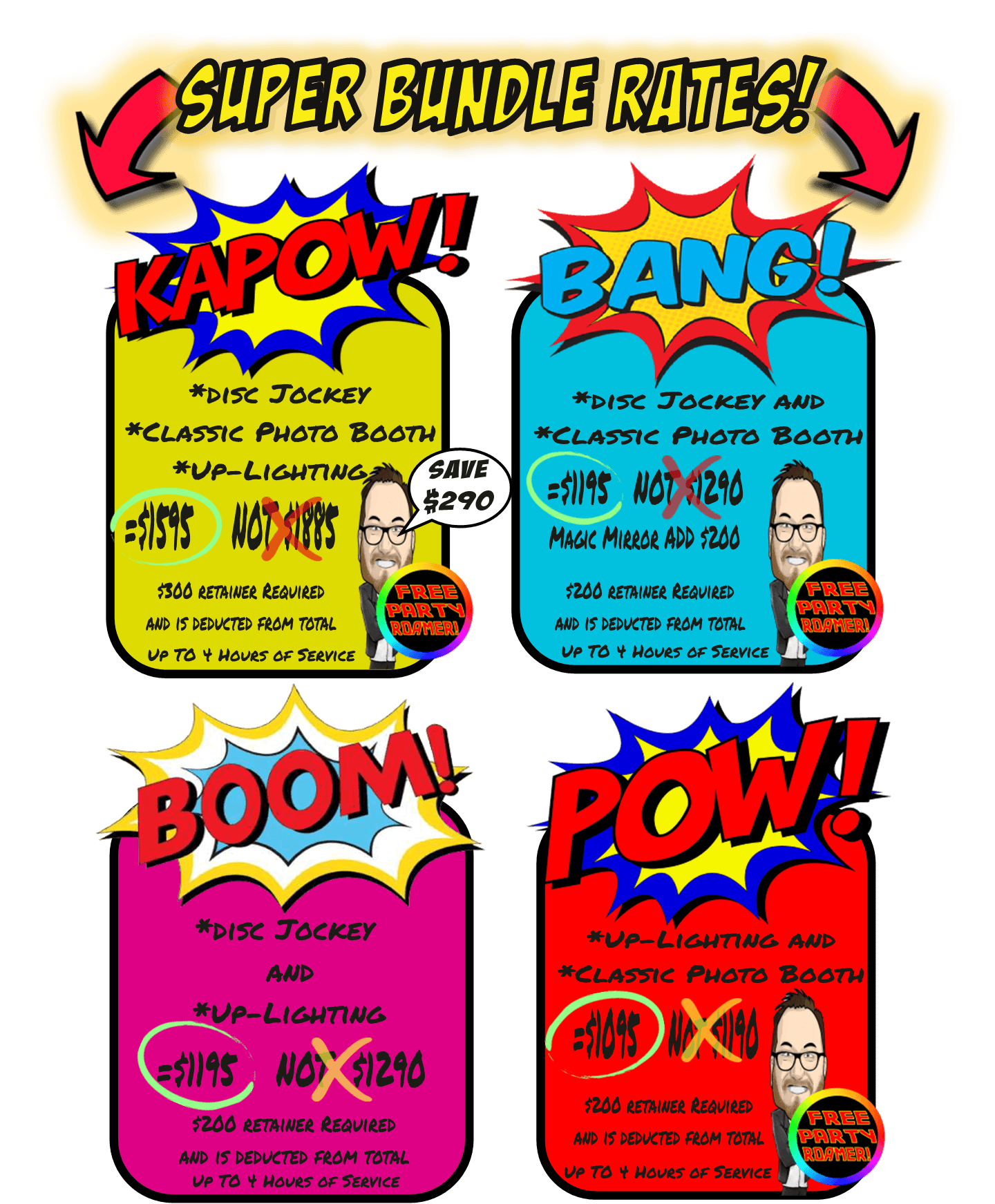 Black Tie Productions: A vibrant promo image titled SUPER BUNDLE RATES! showcases four exciting packages: KAPOW! and BANG! above, with BOOM! and POW! below. Each package offers unique services like a wedding photo booth, disc jockey, or wedding uplighting. Enjoy animated comic effects with a cartoon DJ and save $290!. :Your Event Heroes