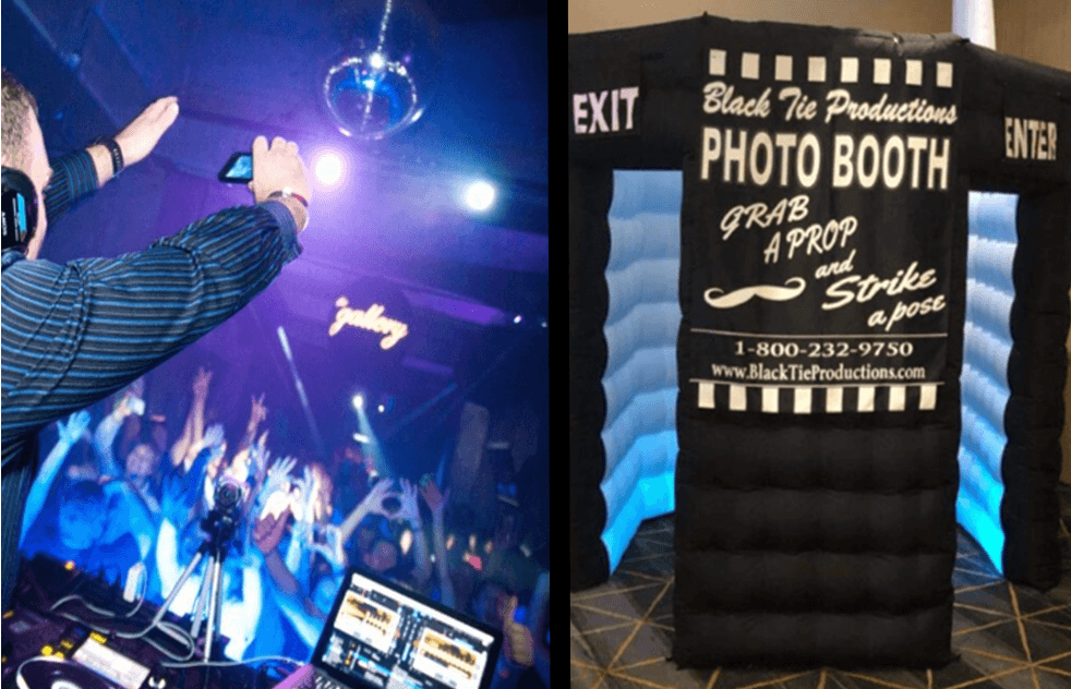 In the vibrant heart of the nightclub, DJ Sonic Boom electrifies the crowd, sending waves of rhythm through every soul. Nearby, like a beacon of fun and glamour, stands the ultra-modern inflatable black photo booth from Black Tie Productions. Guests are drawn to its sleek allure, where they’re transformed into stars by grabbing a prop and striking legendary poses. With Event Heroes on duty, your event transforms into an epic saga of unforgettable moments powered by elite photo booth magic!. :The Event Heroes at Black Tie Productions
