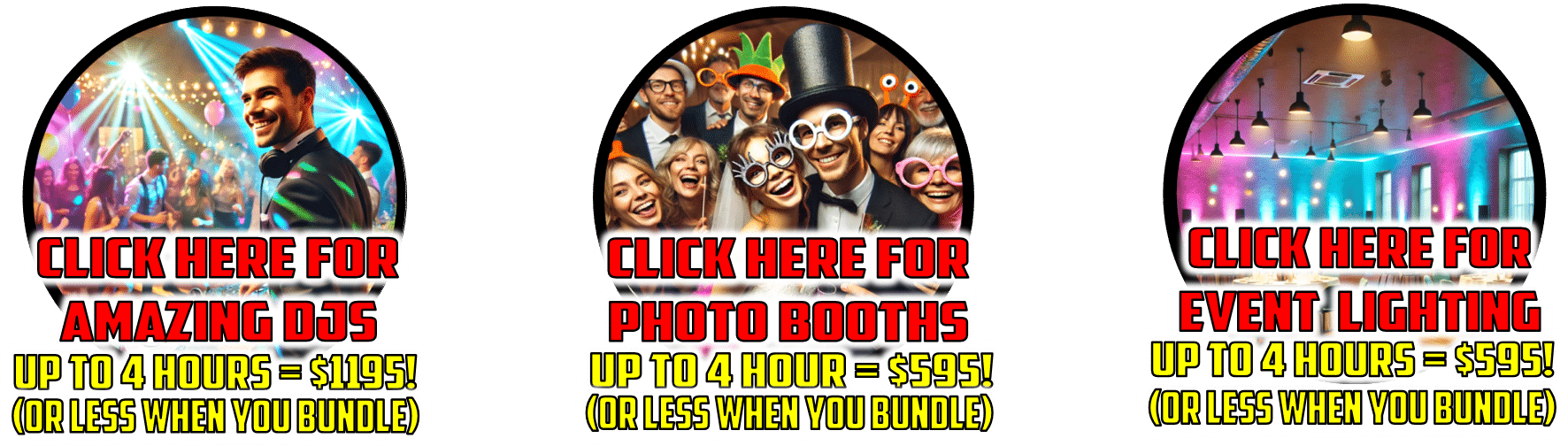 Three dynamic circles showcase heroic deals: DJ Power for $1195, Photo Booth Magic and Lighting Force for $595 each. Click to save!. :The Event Heroes at Black Tie Productions