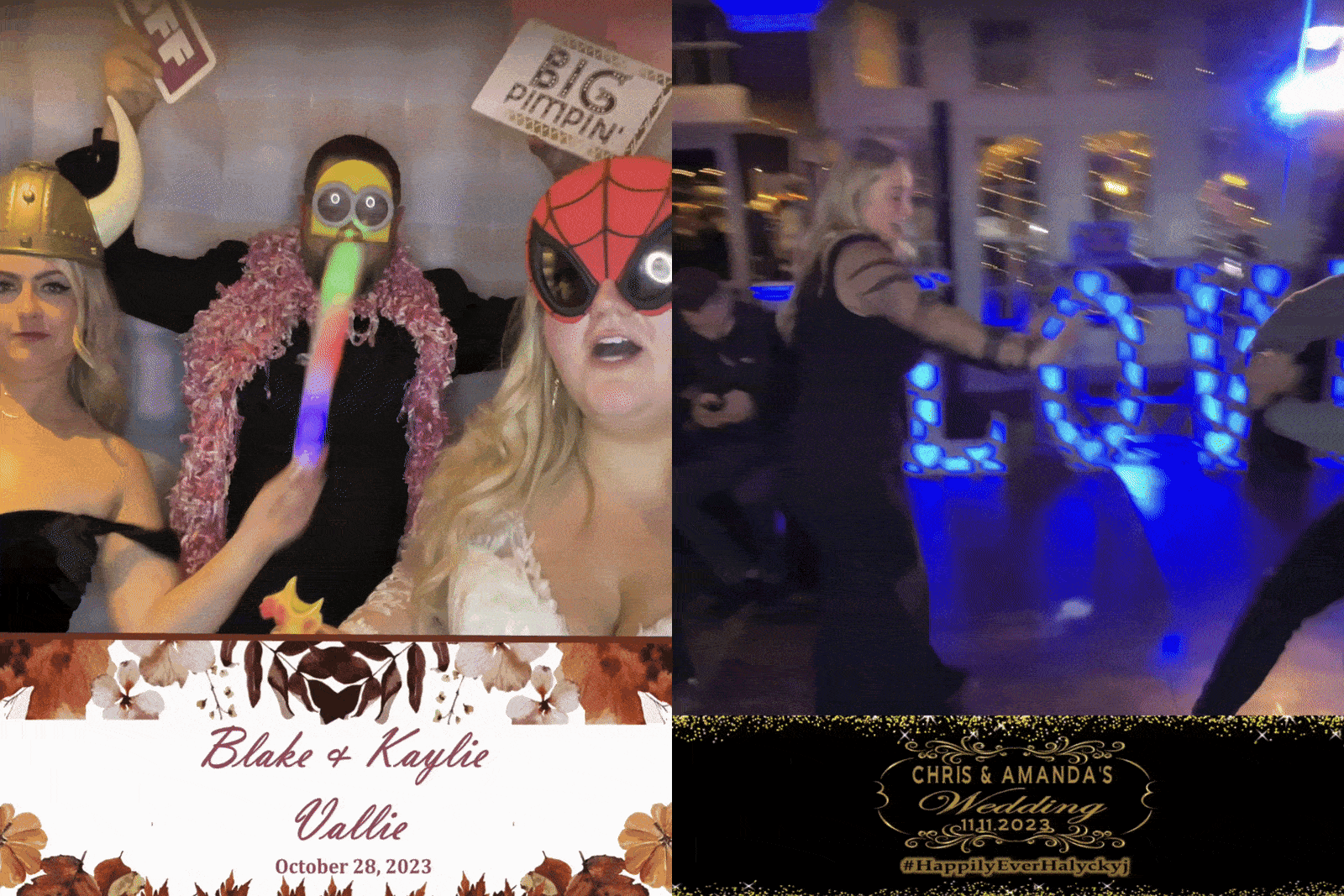 In the dazzling universe of Black Tie Productions, two formidable heroines and a valiant hero strike dynamic poses in the photobooth of destiny, their prop allies at the ready. Meanwhile, on the vibrant dance floor, another heroine is caught in mid-flight, her movements a blur of graceful energy. Around them all, enchanting wedding decorations serve as their regal backdrop, while an overlay of date text casts a spell of timeless charm across this extraordinary moment. :The Event Heroes at Black Tie Productions