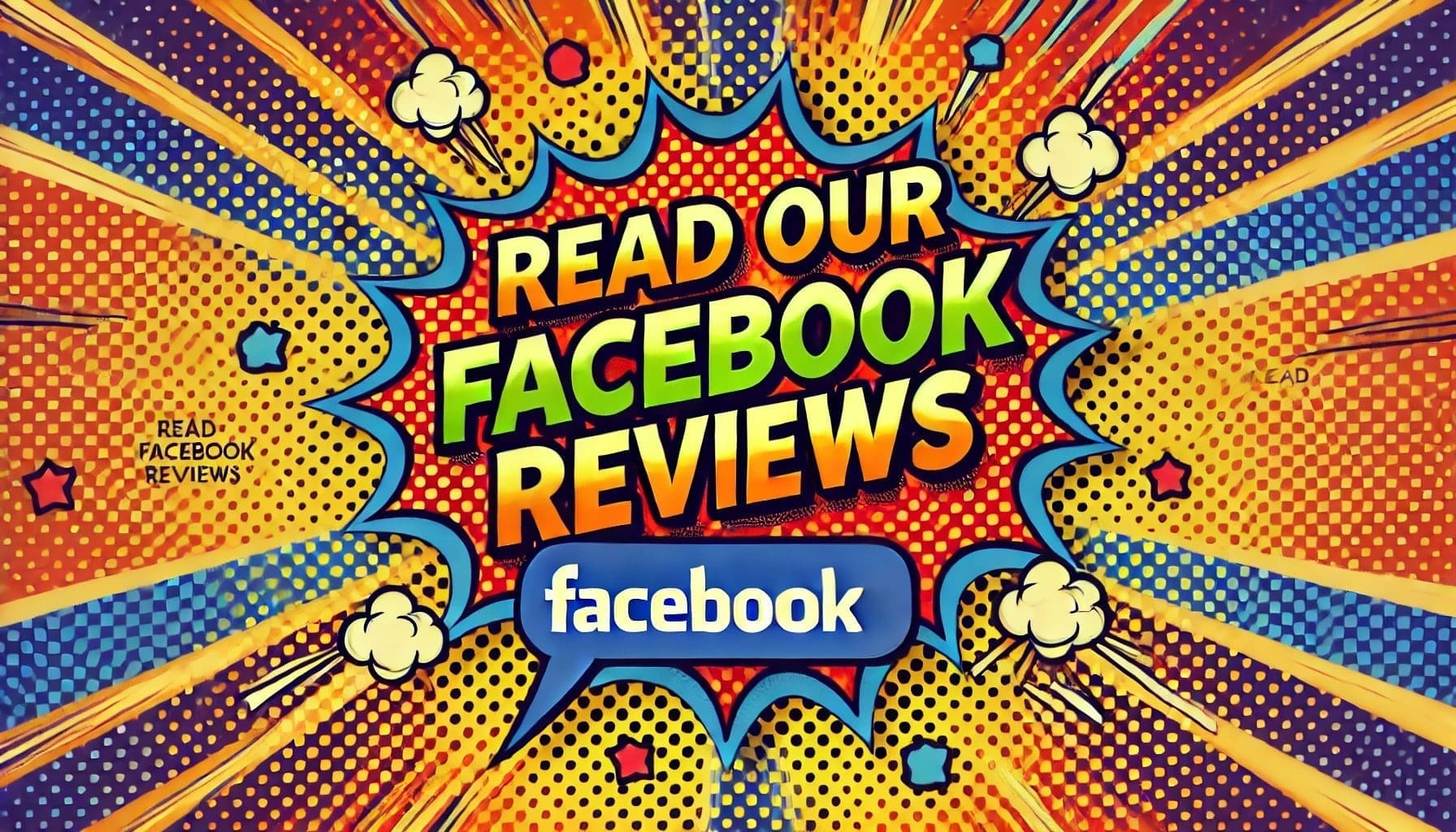 In a dynamic comic-panel explosion, CHECK OUT OUR FACEBOOK REVIEWS! bursts across the center in bold, superhero-style lettering. Below the text, the iconic Facebook logo stands proudly, like a beacon of truth and justice. This vibrant graphic is perfect for spotlighting heroic services like Black Tie Productions event lighting or their photo booth rental options!. :The Event Heroes at Black Tie Productions