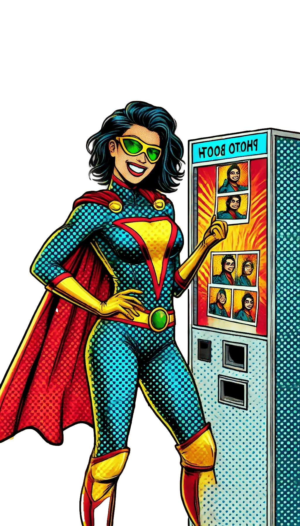In the bustling heart of the city, where adventure eagerly meets the everyday, stands Captain Snapshot! Draped in a dazzling costume bursting with vivid hues of electric blue and fiery red, this photographic phenom strikes a dynamic pose beside the wondrous Photo Fantastica! With panels showcasing endless snap-tastic memories, our vibrant hero exudes charisma and charm. Each photo captures their legendary moments—an action-packed chronicle preserved in brilliant color. Its not just a booth; its Captain Snapshots remarkable realm of instant adventures!. :The Event Heroes at Black Tie Productions