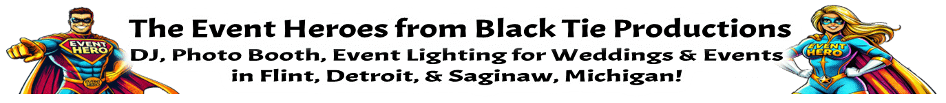 Behold the epic depiction of dynamic duos: a fearless male and female superhero, standing tall and ready to save the day! Join forces with Black Tie Productions for an extraordinary event experience. Unleash the power of electrifying DJs, capture unforgettable moments with our state-of-the-art photo booths, and illuminate your celebration with dazzling lighting effects. From Flint to Detroit to Saginaw, Michigan, we transform ordinary events into legendary adventures!. :The Event Heroes at Black Tie Productions