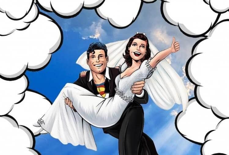 Event Heroes unleash a vivid, comic-book spectacle featuring a groom transformed into a dashing superhero, soaring through the blue skies with his radiant bride in his arms. Framed by billowing clouds, this scene captures the essence of love and adventure. As Michigan’s beloved wedding DJ duo, they ignite every celebration with electrifying event lighting that sets the stage for unforgettable memories. :The Event Heroes at Black Tie Productions