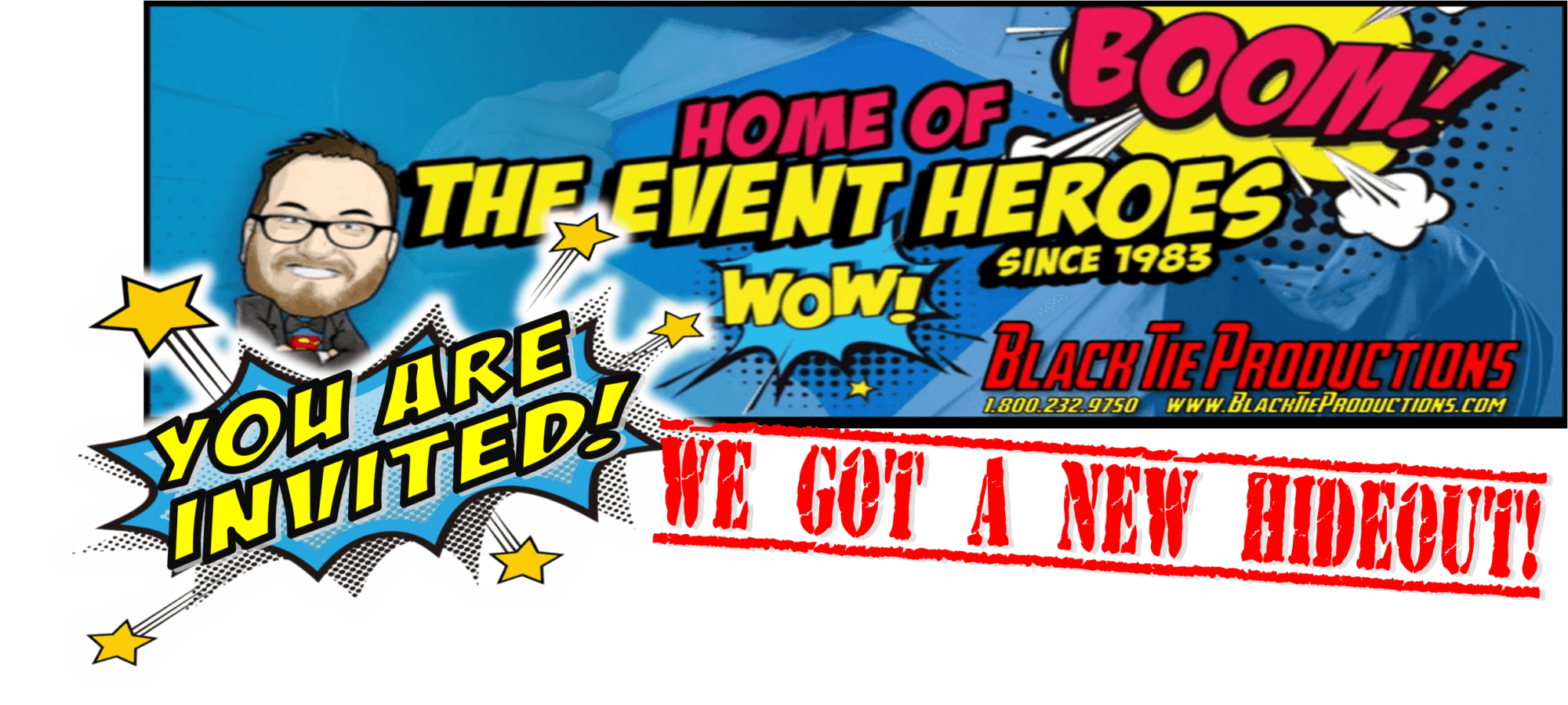 CALLING ALL SUPERHEROES! Unleash your inner hero and join the LEGENDARY LEAGUE of Event Guardians! 🦸♂️✨ Since 1983, weve been defending the art of celebration, and now… KAPOW! Weve moved to a BRAND-NEW HQ! 🎉 Stand by for EPIC excitement with our Michigan Wedding DJ Services – transforming ordinary gatherings into UNFORGETTABLE ADVENTURES! Featuring: – *Contact Details*: So you can reach us faster than a speeding bullet! – Legendary cartoon characters ready to turn your party into a comic book spectacle. Dont miss out on this SUPER event… Assemble with us and make history all over again! *Heroic RSVP below!*. :The Event Heroes at Black Tie Productions