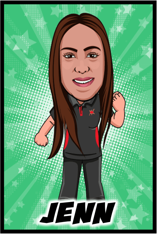 Behold the majestic illustration of our daring hero with flowing brown locks, exuding power and confidence. Clad in a striking black and red ensemble, they stand poised and ready for action. Against a vibrant green starburst backdrop, this image serves as the ultimate inspiration for event lighting or an electrifying addition to your photo booth rental theme. The name JENN blazes boldly below, marking their legendary presence!. :The Event Heroes at Black Tie Productions