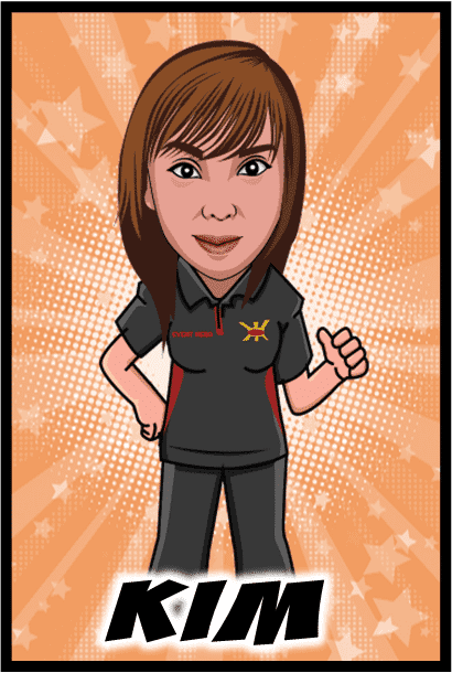 In a world bursting with vibrant colors and dynamic energy, behold the mighty cartoon character! Adorned in an awe-inspiring ensemble of black and red, their brown hair gleams with courage. With a fearless thumbs-up gesture, they stand triumphant against an explosive orange starburst backdrop. Below the spectacular figure, the name KIM boldly proclaims their legendary status. This captivating image captures the essence of Event Heroes—a blend of excitement and professionalism that electrifies every occasion!. :The Event Heroes at Black Tie Productions
