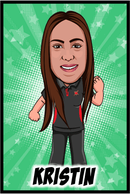 Black Tie Productions: Cartoon drawing of a woman with long brown hair, wearing a black and red sports shirt and black pants. Her right arm is bent confidently into a fist. The green background features starburst patterns, with KRISTIN in bold letters at the bottom—a vibrant nod to Michigan wedding entertainment. :Your Event Heroes