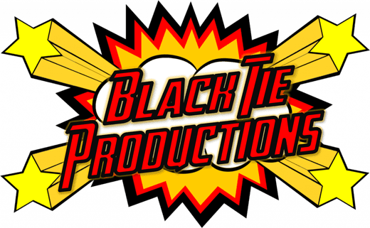 Black Tie Productions: The logo, designed in a comic style, features Black Tie Productions in bold red letters outlined in black. The vibrant explosion graphic with red spikes, yellow stars, and clouds reflects the dynamic energy of Michigan wedding entertainment. :Your Event Heroes