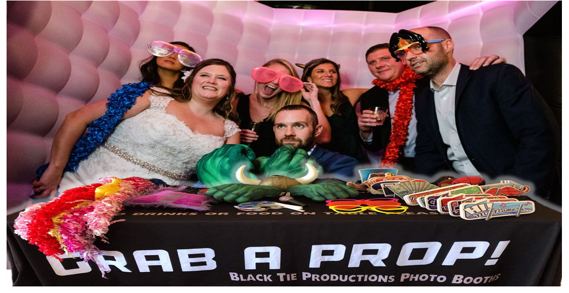 Black Tie Productions: A group of eight people, dressed in formal attire, enjoys a wedding photo booth with playful props. They wear oversized sunglasses, hats, and feather boas. A table labeled Grab a Prop! offers more choices. The backdrop features an inflatable white wall enhanced by vibrant wedding uplighting. :Your Event Heroes