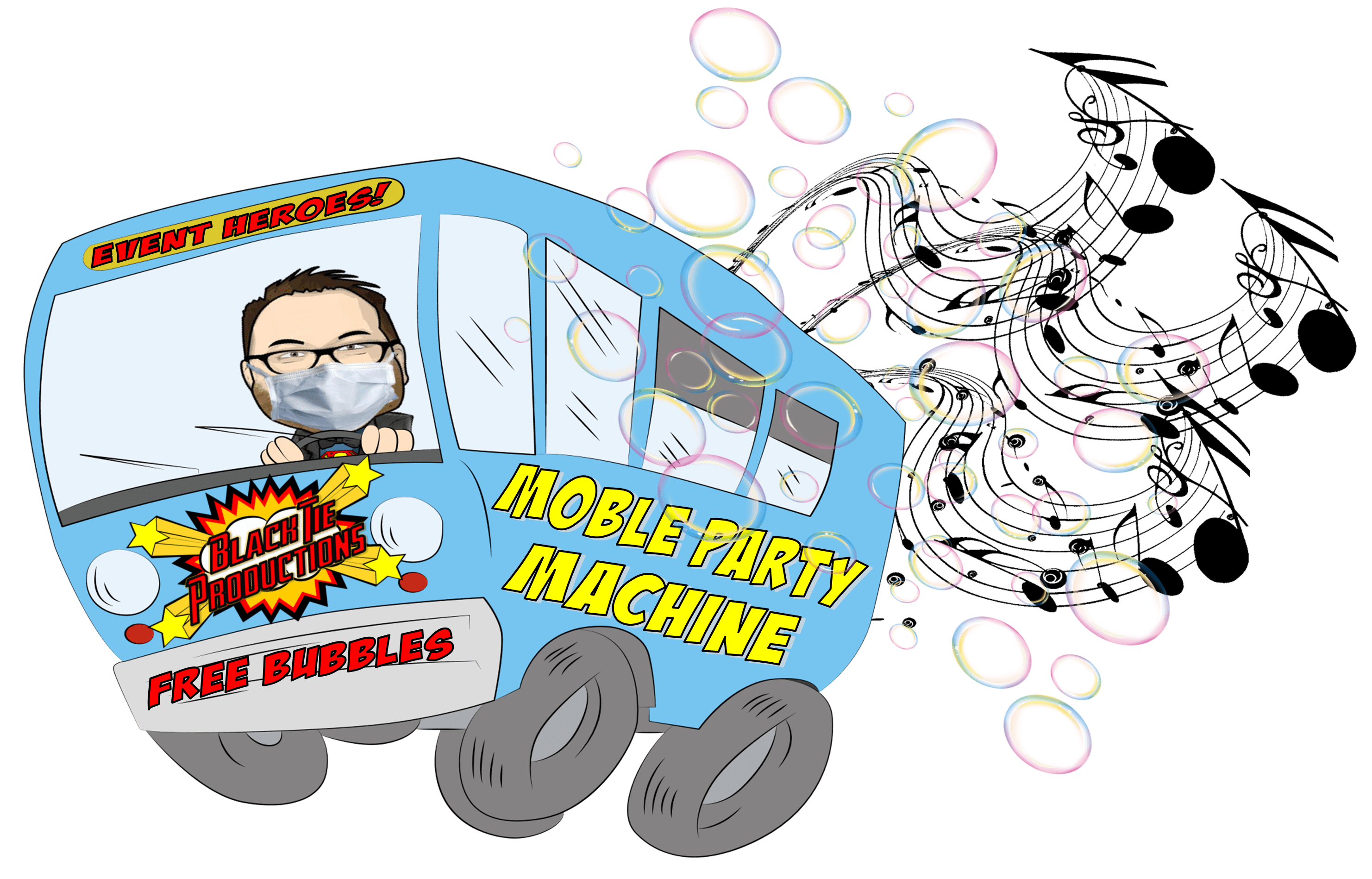 Black Tie Productions: A cartoon of a blue Mobile Party Machine bus driven by a person wearing glasses and a mask. The bus proudly displays comic-style text: Event Heroes!, Free Bubbles, and Blach Productions. Colorful bubbles float from the bus, adding to the festive atmosphere, perfect for Michigan wedding entertainment. :Your Event Heroes