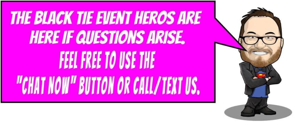 In a world where curiosity reigns supreme, one mighty figure stands ready to assist! Behold, a bespectacled hero with a noble beard, clad in the sleek armor of elegance – the Tuxedo Titan! With unwavering confidence and preparedness, he proclaims from his powerful speech bubble: Fear not, citizens! The Event Heroes have arrived to vanquish any queries that dare cross your path. Summon us with the legendary Chat Now button or unleash the power of your call or text for an instant price quote. Your answers are just an action away!. :The Event Heroes at Black Tie Productions
