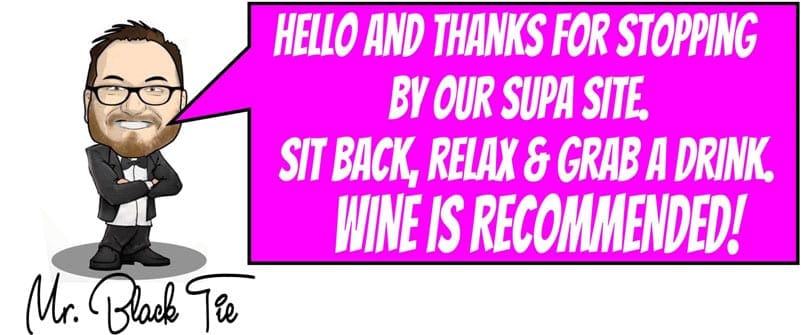 Black Tie Productions: A cartoon character with glasses and a beard, dressed in a black suit and white shirt, smiles with crossed arms. A pink speech bubble reads, Hello and thanks for stopping by our supa site. Sit back, relax & grab a drink. Wine is recommended! Perfect for Michigan wedding entertainment like photo booths! Below, it says Mr. Black Tie. :Your Event Heroes