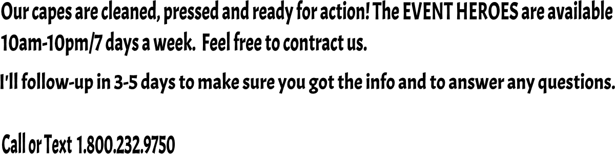 By the power of Event Heroes, we stand ready to assist with your every need from 10 AM to 10 PM daily! Whether youre in pursuit of epic event lighting or other extraordinary services, our mighty team will respond within a swift 3-5 days. For any inquiries or a call to action, reach out via phone or text at 1-800-232-9750. Villains of event chaos, beware!. :The Event Heroes at Black Tie Productions
