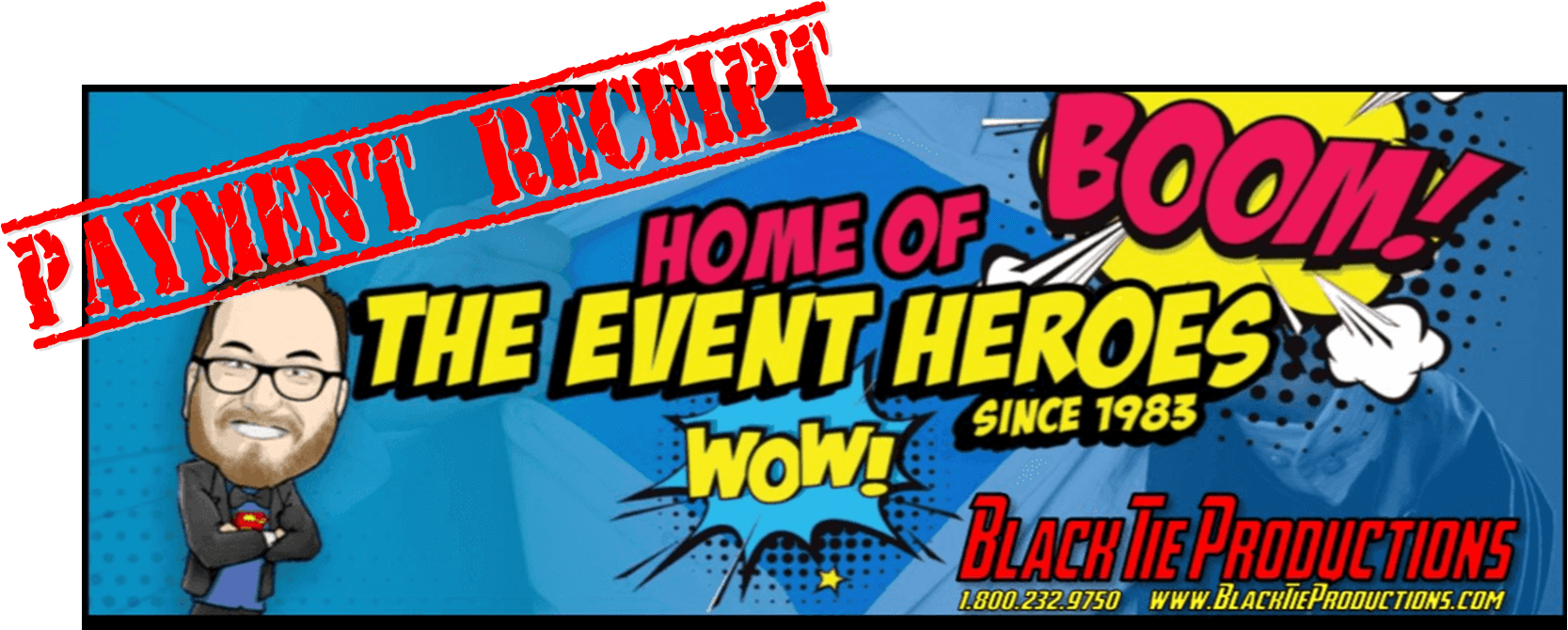 In a vibrant cartoon universe comes a thrilling banner from Black Tie Productions, where heroism meets celebration! Behold the mighty Event Hero, cape billowing as he emerges in full color. Bold letters declare: Home of the Event Heroes!—your ultimate destination for exceptional event lighting and Michigans premier wedding DJ services. Standing sentinel over your special occasions, this heroic figure ensures that every event is extraordinary. Whether wielding light to craft an unforgettable atmosphere or spinning tunes like a maestro at your nuptials, Black Ties superhero squad is here to save the day! And remember, securing these super services comes with its own document of triumph—Payment Receipt.” With our heroes by your side, prepare for an event that stands out above the rest!. :The Event Heroes at Black Tie Productions