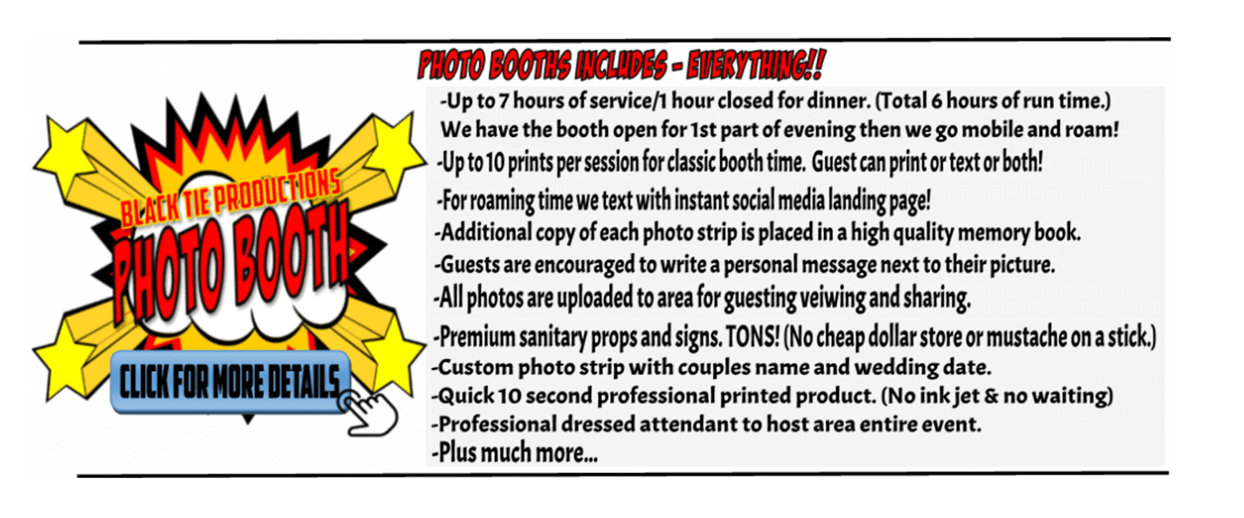 Black Tie Productions: Graphic for Black Tie Productions Photo Booth highlighting top-tier services, such as up to 7 hours of coverage, instant social sharing, premium scrapbooks, and custom prints. Perfect for Michigan wedding entertainment with a formal host and top-notch photo quality. :Your Event Heroes