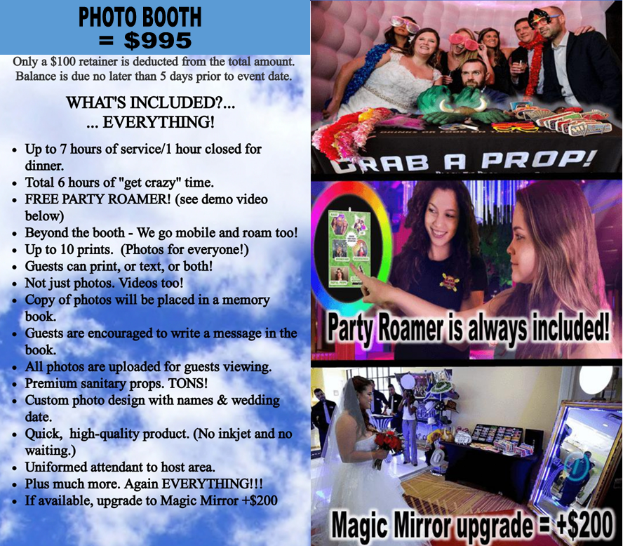Black Tie Productions: A collage featuring photo booth rental details. Top left: Price and included services listed, like unlimited photos and props. Center: Two women smiling with photo booth props. Bottom: Group enjoying the wedding photo booth with colorful lights. Bottom right: Magic Mirror upgrade with an attendant for added party entertainment. :Your Event Heroes