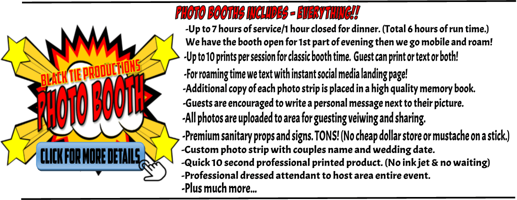 Unleash Your Inner Hero with the Ultimate Photo Booth Experience! Step into a world of vibrant adventure with our comic-style photo booth extravaganza! ⚡️ Legendary rentals by Black Tie Productions promise to transform any event into an epic celebration. With All-Powerful Photo Booths that come fully equipped, you’ve got everything you need to capture your heroic moments! 🦸♀️ Photo Booths Include Everything!! 🦸♂️ Hit that button for more thrilling details and let us illuminate your event with top-notch photo booths and dazzling lighting effects that take your party from ordinary to extraordinary!. :The Event Heroes at Black Tie Productions