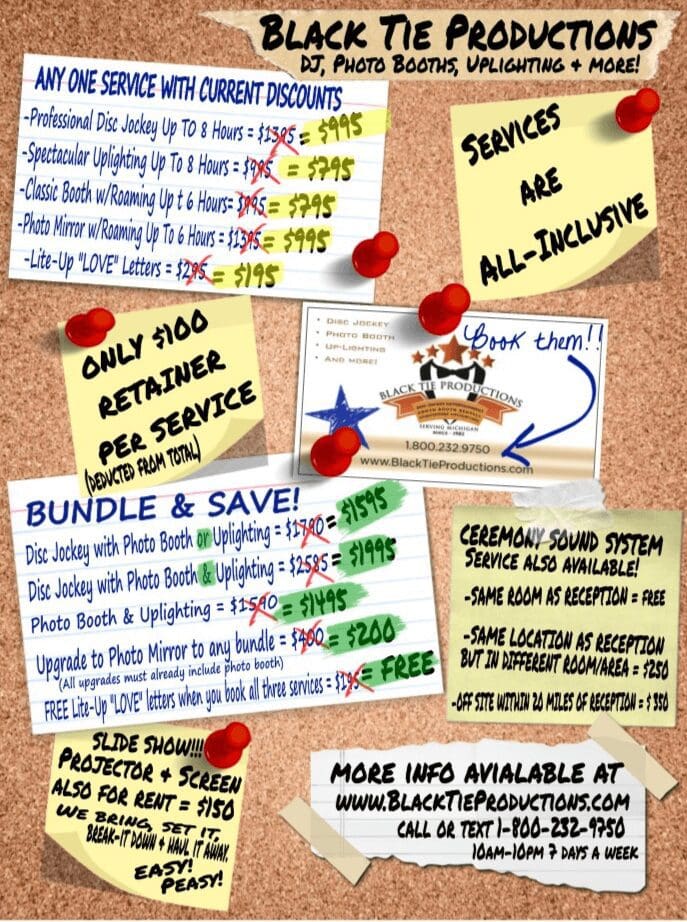 Unleash the power of Black Tie Productions and transform into the Event Hero you were destined to be! With our legendary DJ services, epic photo booths, and dazzling event lighting, your event will be nothing short of spectacular. Venture into our realm of unbeatable package deals and lock in your date with our enticing retainer fees. For more information and heroic details outlined by bold red pins and notes, reach out to us now and embark on your journey as an Event Hero!. :The Event Heroes at Black Tie Productions