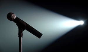 Black Tie Productions: A microphone is positioned on a stand in the foreground under a bright spotlight, ideal for a fun wedding DJ. The dark background creates a dramatic contrast, enhancing the microphones sleek design. The focused beam of light suggests an engaging performance setting, perfect for wedding uplighting. :Your Event Heroes